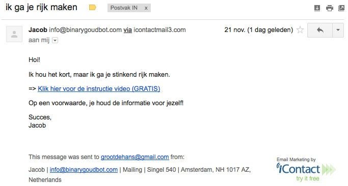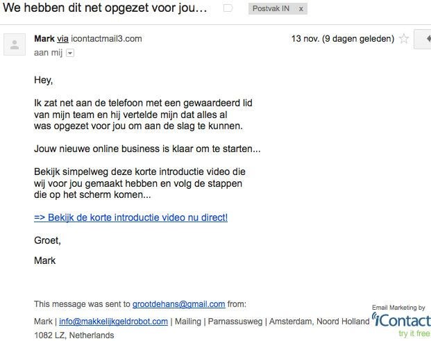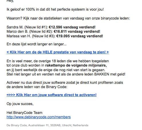 Iedere week krijg ik meerdere keren mails van mensen die me rijk willen maken, maar dan als eerste een geldbedrag zelf willen vragen. Ze laten je geloven dat ze je het geld terug zult geven wanneer je het aan zult geven, maar alles behalve dit is werkelijk het geval. Het zijn dus gewoon oplichters die veelvuldig gebruik willen maken van het medium internet en dan duizenden keren iets versturen als een soort van visjes vangen in de internetzee, Een volledig computergestuurd programma waar ze zelf mee winst proberen te maken en dat ze waarschijnlijk als soortgelijke handel weer door willen verkopen.